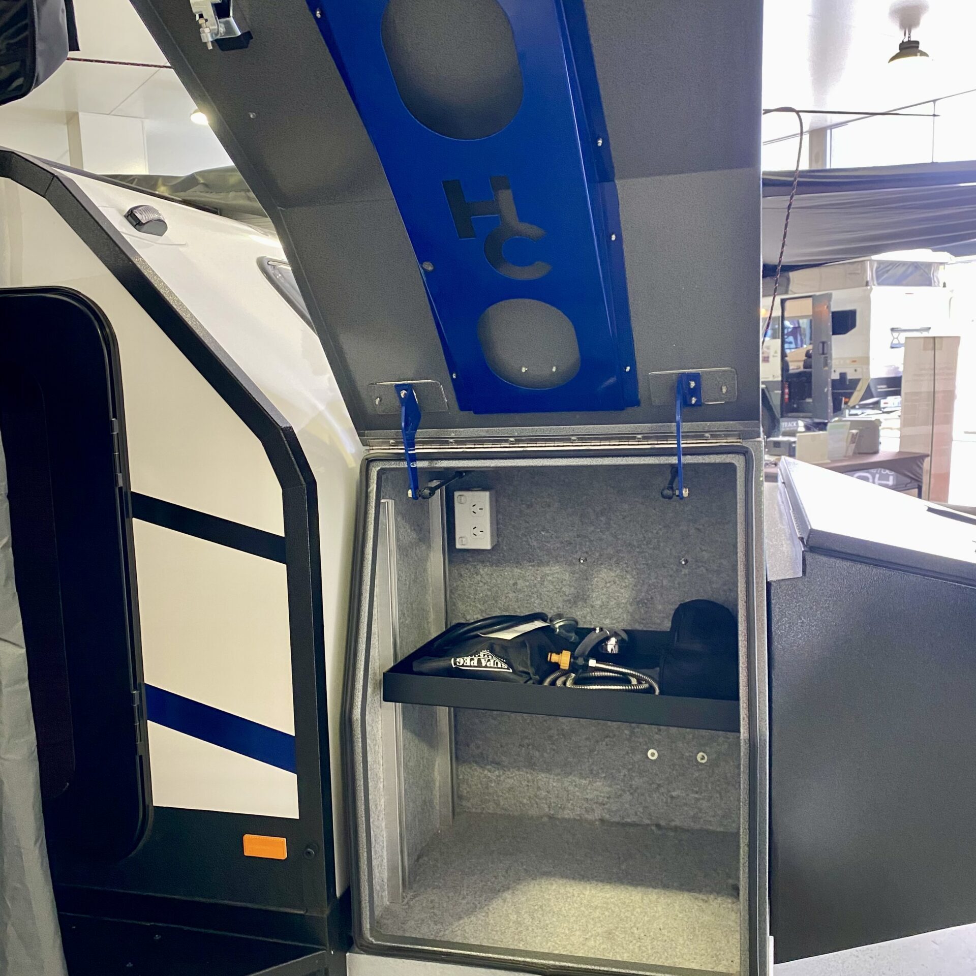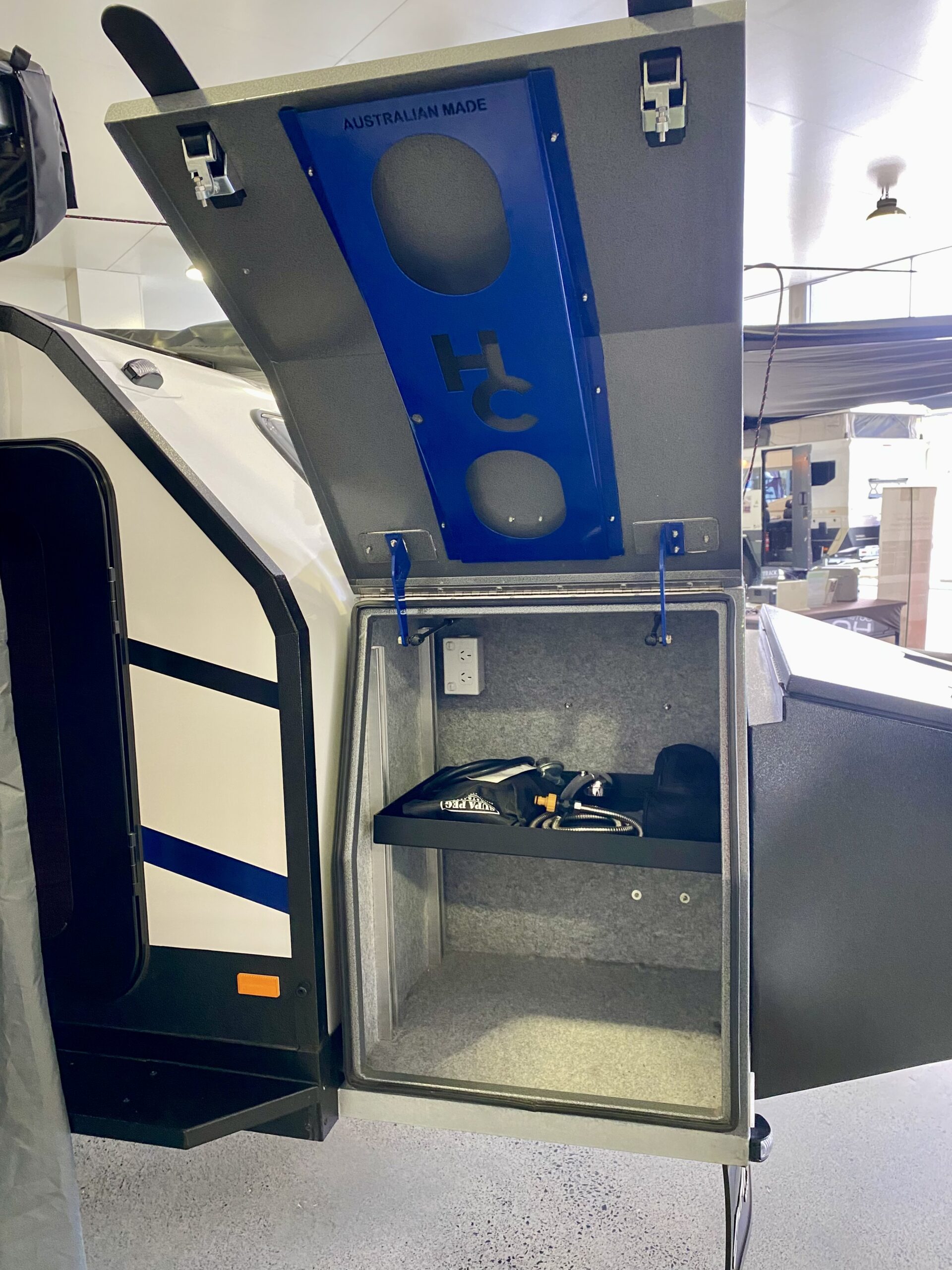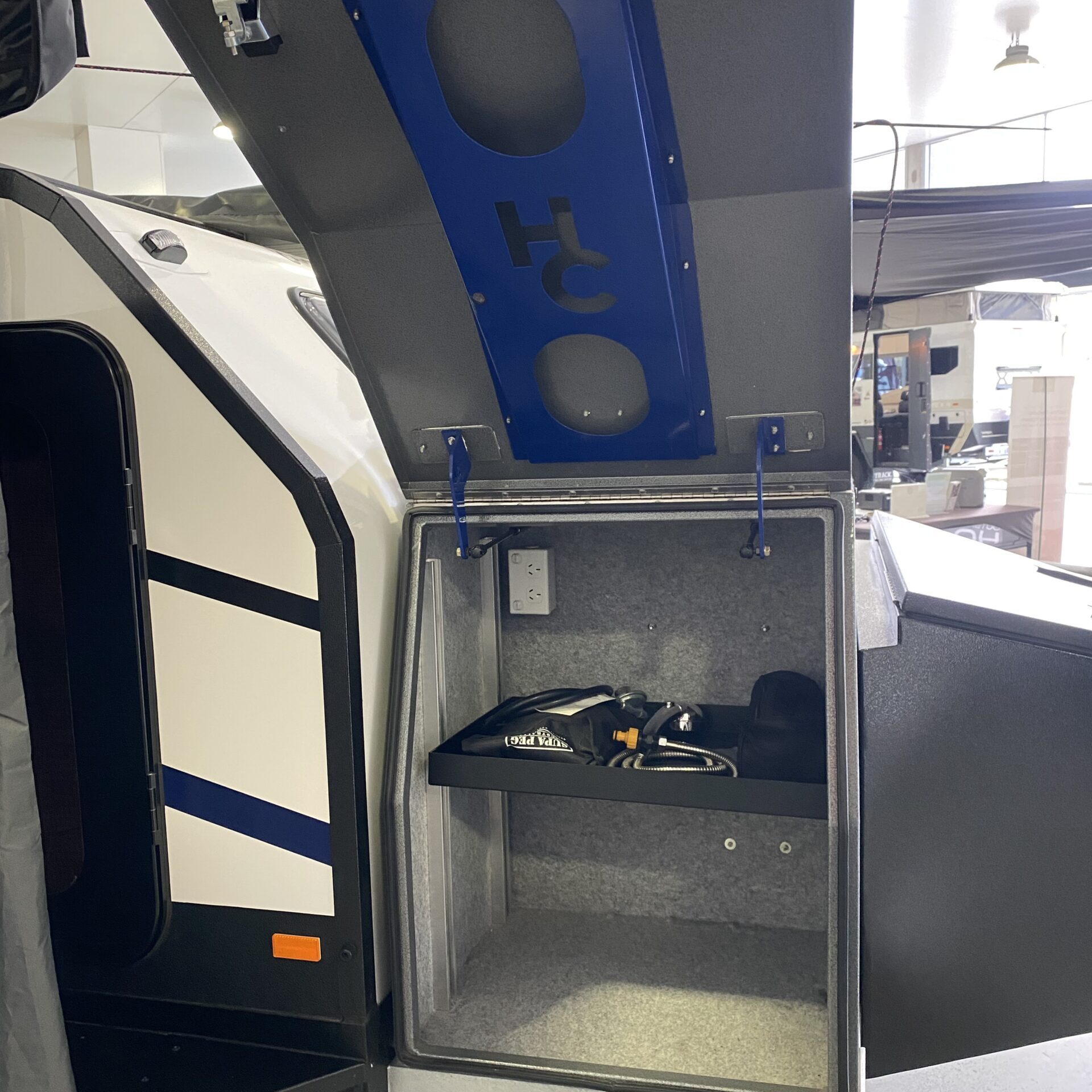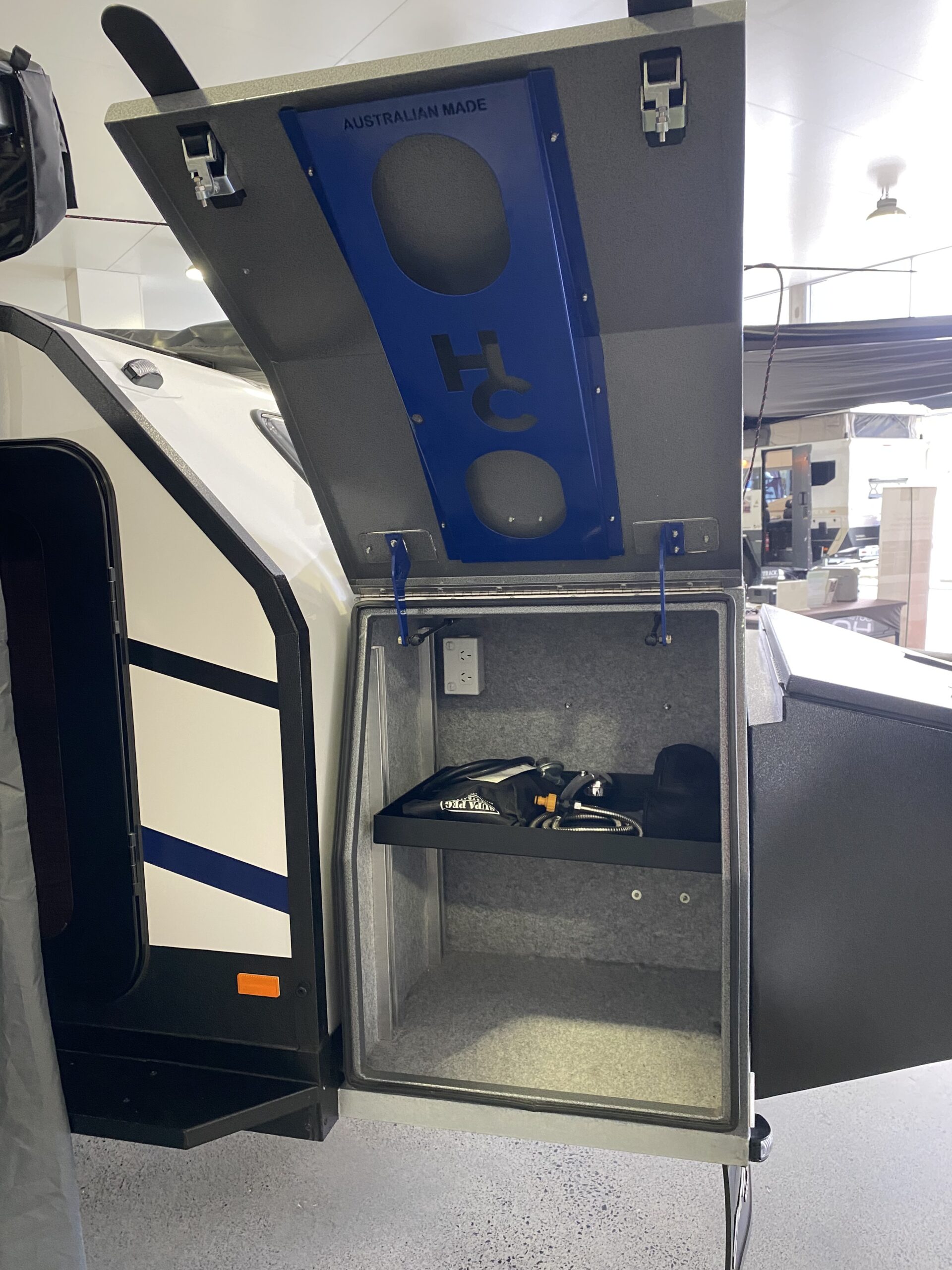Front boot – 2 x sealed lockers with power & fridge slide Standard * Storage locker lighting