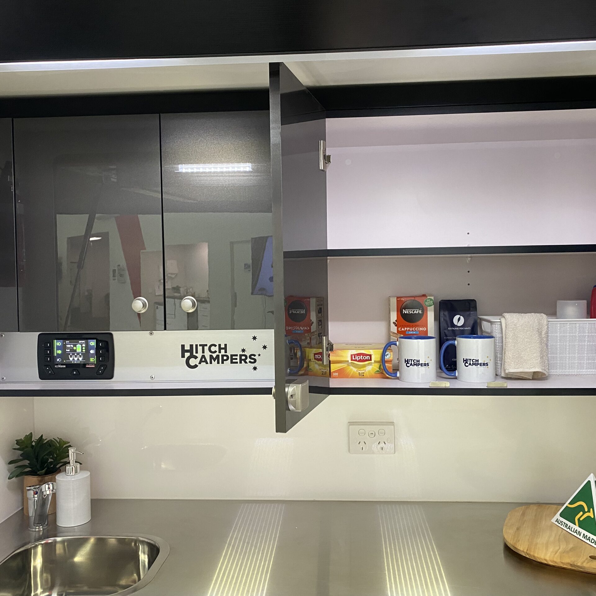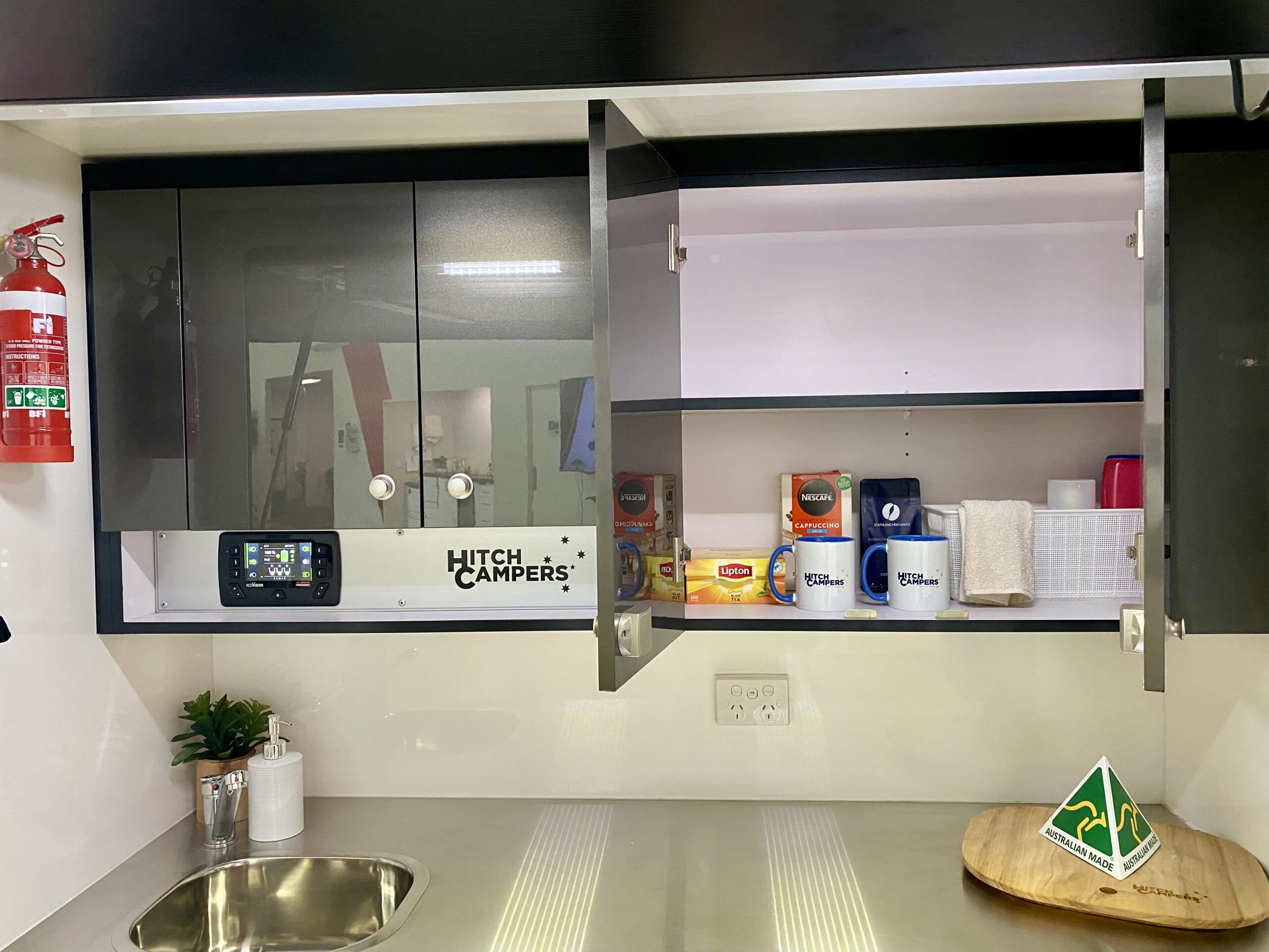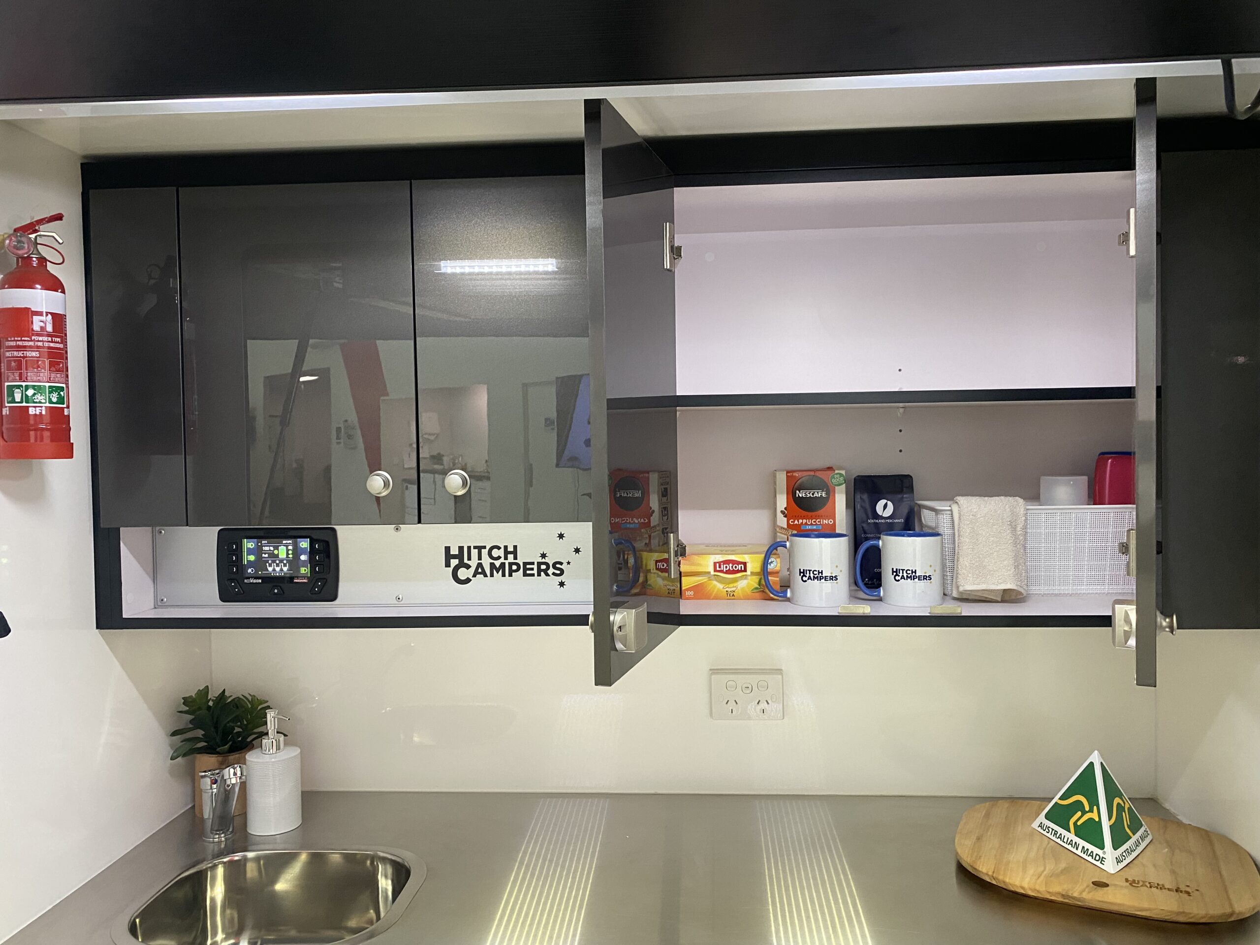 Hot and cold water plumbed to kitchen * Under kitchen LED light * Yellow & white light over kitchen * 1 x 12V merit plug in kitchen locker