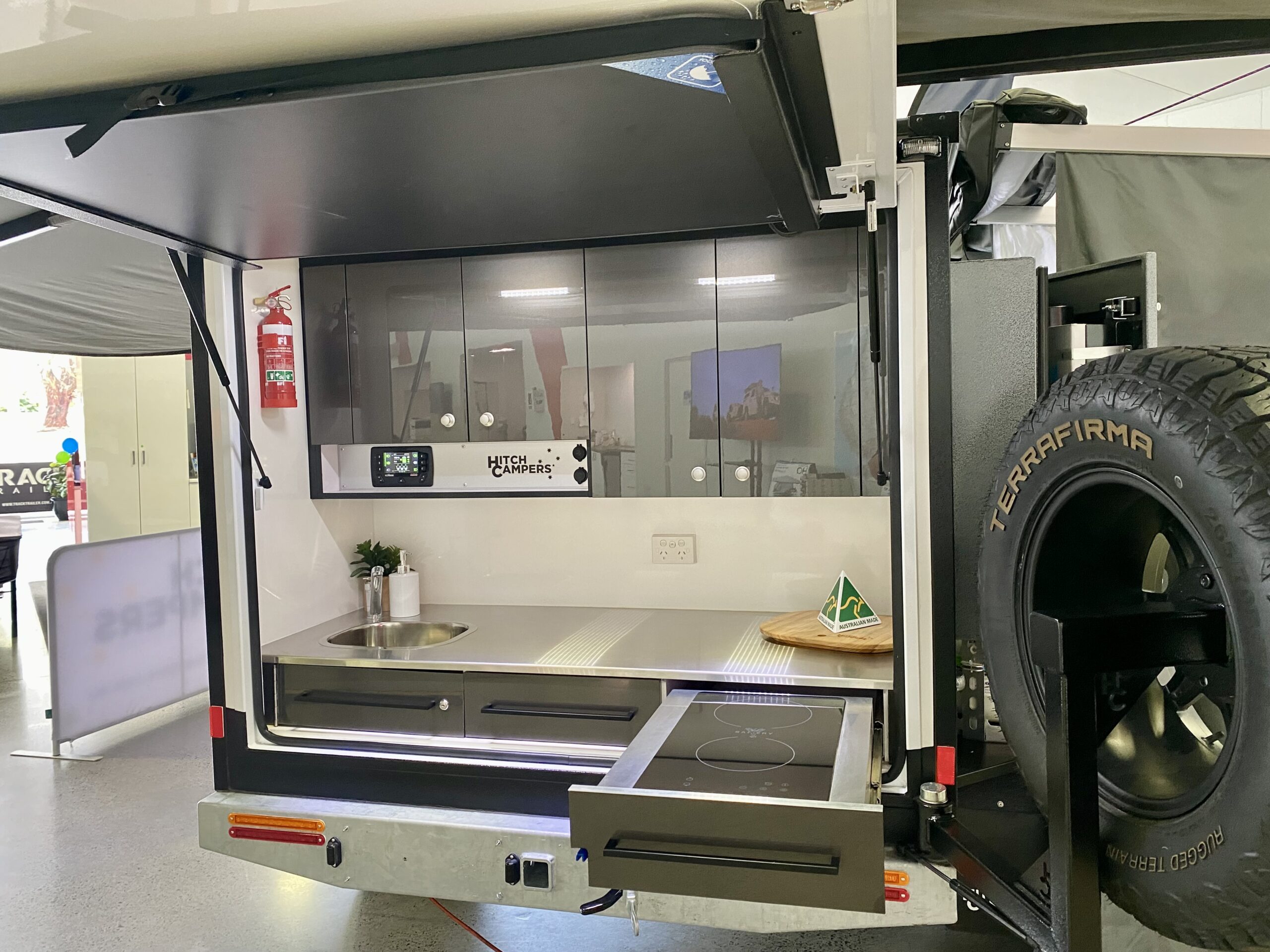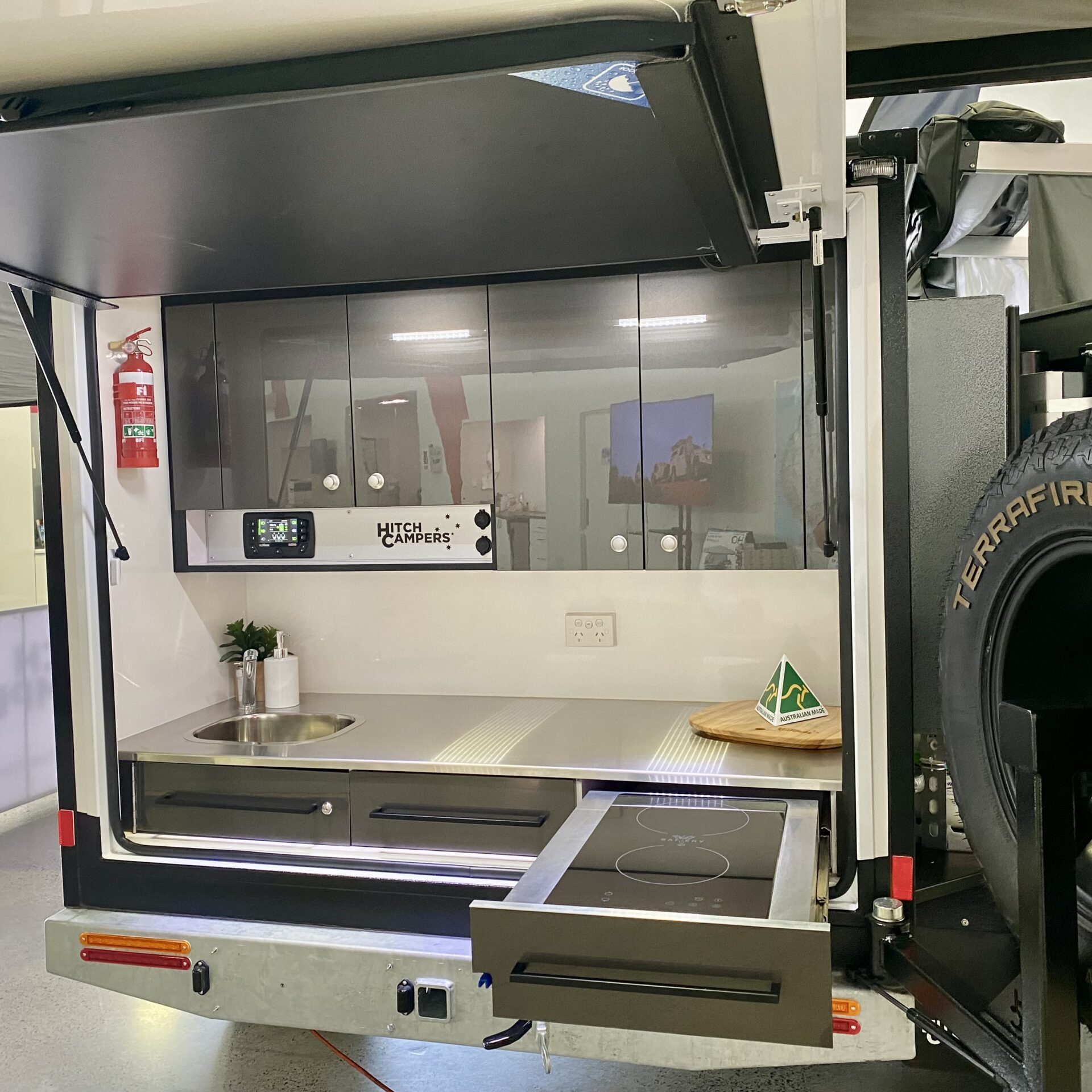 The Tvan Lightning is packed with top-tier features, including a 2-hob induction cooktop in a stainless steel kitchen with hot and cold water plumbed to the sink. A 2000W inverter provides