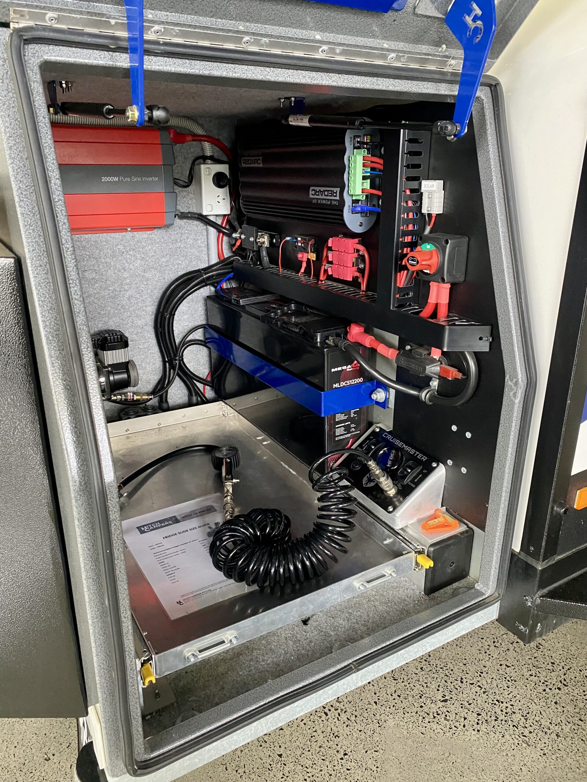 2 x 250Ah Lithium LiFeP04 batteries * Underbed mounting of batteries, inverter, charges, circuit breakers, iso switch. Update to interior console & repurposed battery boxes