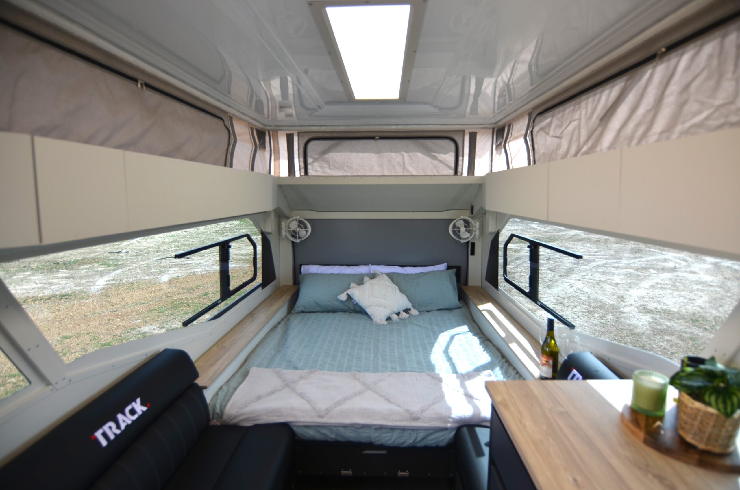 - Proprietary fibreglass roof, Australian canvas PU skirt with